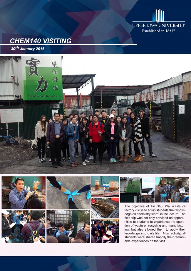 CHEM140 Visiting EventBy uiuJanuary 30, 2016The objective of Tin Shui Wai waste oil factory visit is to equip students their knowledge on chemistry learnt in the lecture…