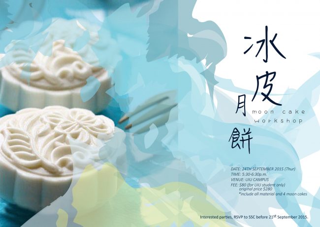 Moon Cake Workshop EventBy uiu24 9 月, 2015DATE: 24TH SEPTEMBER 2015 (Thur) TIME: 5:30-6:30p.m. VENUE: UIU CAMPUS FEE: $80 (for UIU student only)